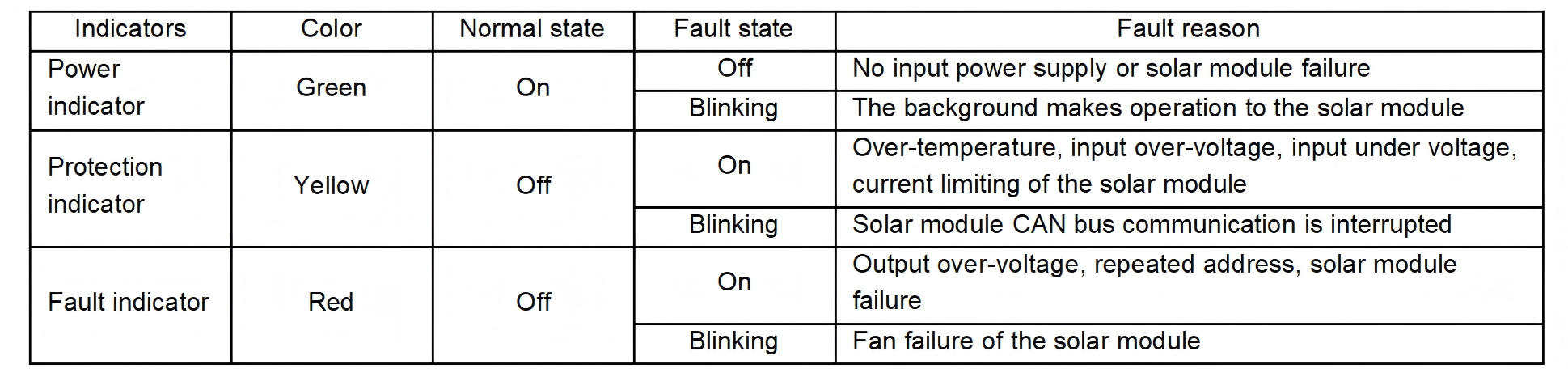 When an over temperature protection occurs, the solar module reports the alarm signal to the controller for corresponding handling. When the internal temperature of the solar module restore to normal value (the return difference is larger than 5°C), the solar module will resume working automatically, and the over temperature alarm will disappear.